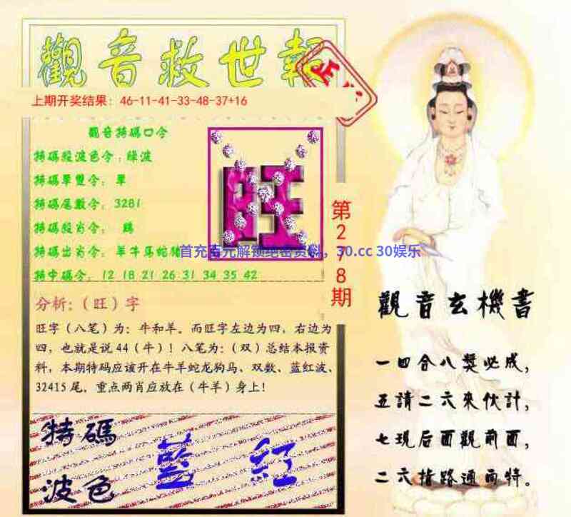 273期 四七之数特别看,五码分开乐有余。三瓣柳絮浮二六,看破看好三三连。 解:四七之数特别看,四岁虎,七岁猪,四十七羊。五码分开乐有余,五码,取五岁牛。三瓣柳絮浮二六,三岁兔,二岁龙,六岁鼠。看破看好三三连,三三连,三岁兔,三十三鸡 九肖:虎猪羊牛兔龙鼠鸡蛇 七肖:虎猪羊牛兔龙鼠 五肖:虎猪羊牛兔 三肖:虎猪羊 一肖:虎 |
